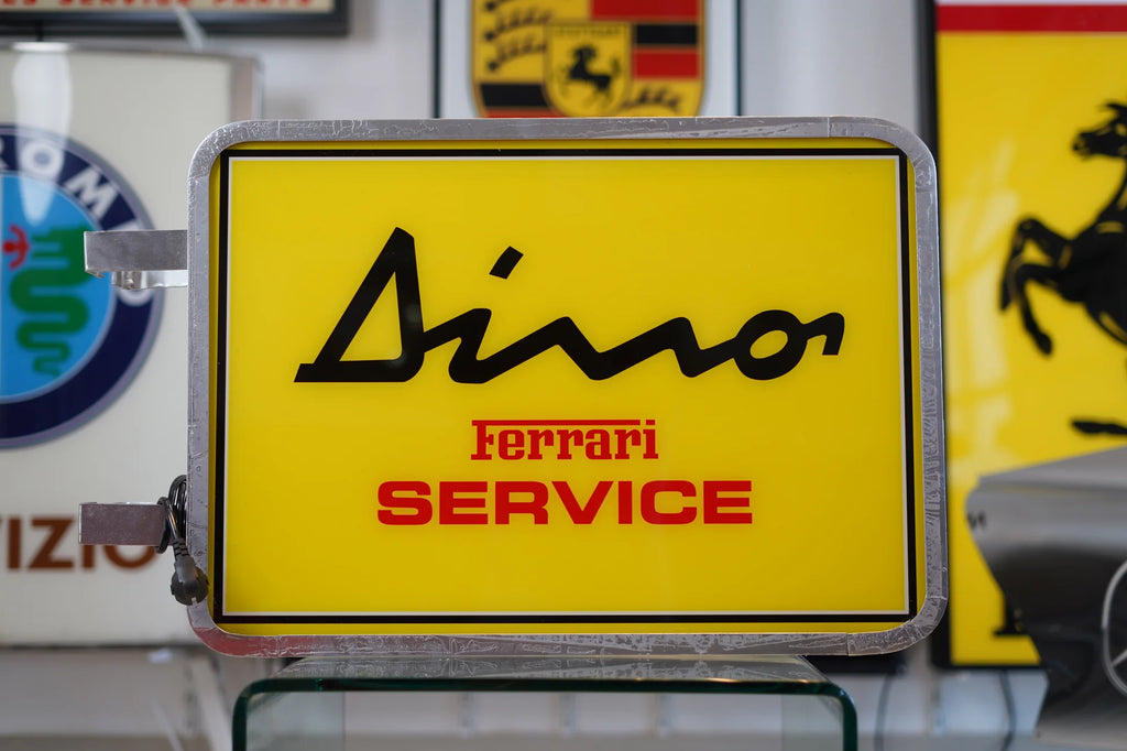 A rare and exceptionally well-preserved early 1990s Dino Ferrari “Service” double-faced illuminated dealership sign, presented in remarkable, near-new old stock condition—having remained uninstalled and undisplayed for over three decades following its original delivery to an Italian Ferrari dealership.