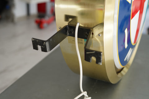 Of particular note is the sign’s architectural depth (20 cm), giving it a sculptural, almost horological quality when viewed in profile. The original mounting bracket remains intact, allowing for wall projection as intended in period showroom environments, while the internal illumination provides a warm, even glow across both faces.